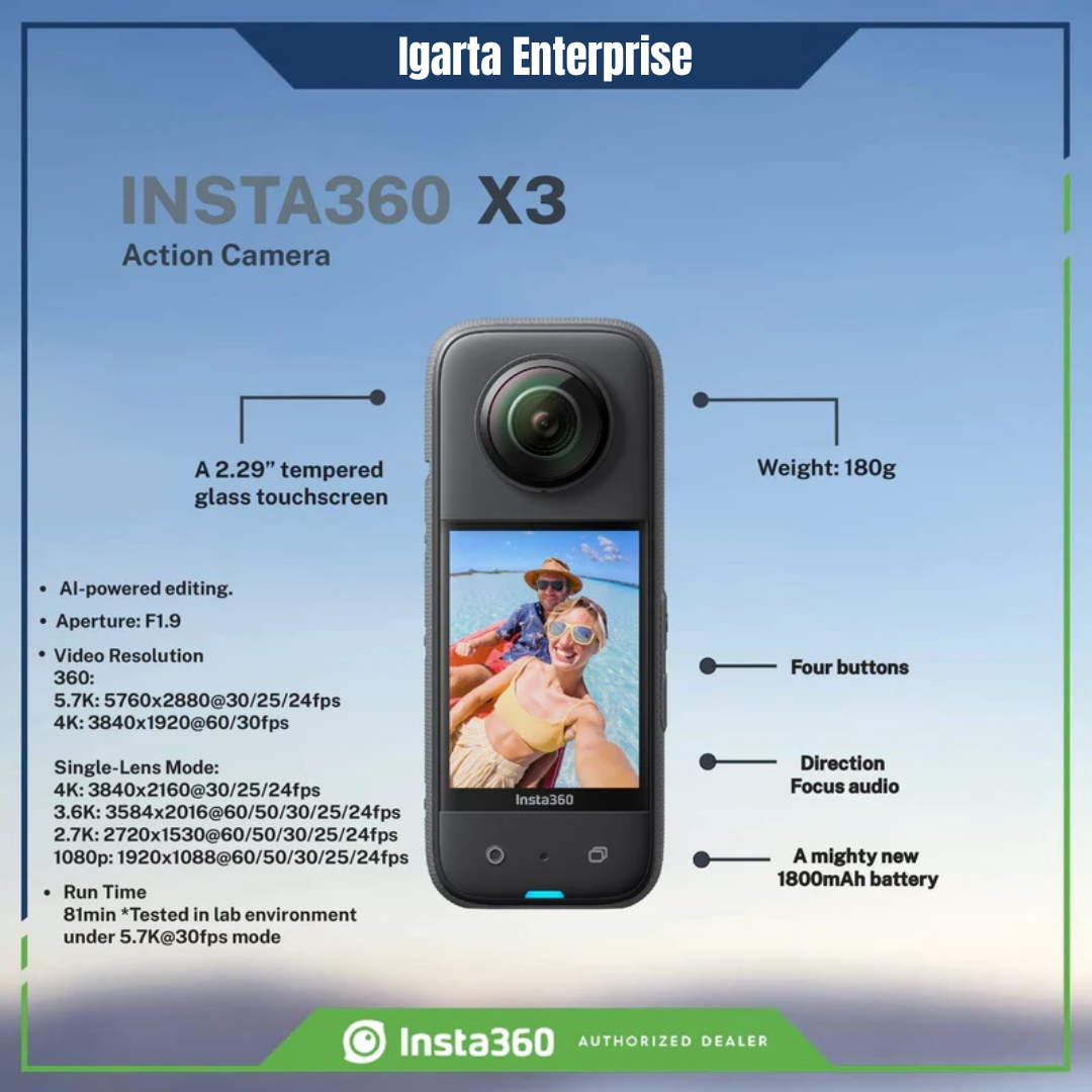 Insta360 X3 is rugged and waterproof to 33ft (10m) out of the box. Lens guards are also available for action sports creators who want increased protection.