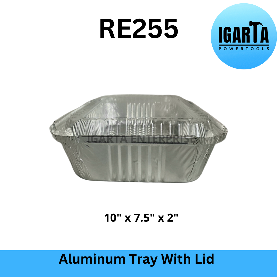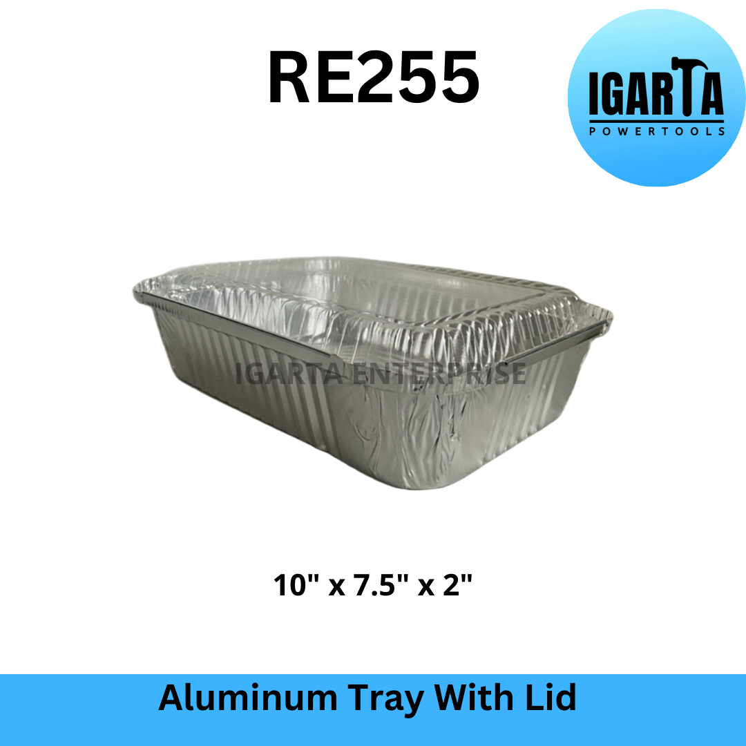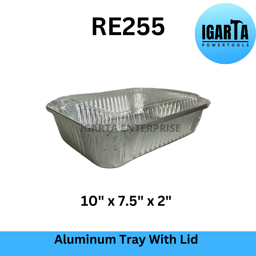 RE255 Aluminum Tray with Lid - 10x7.5x2 Inches is a food grade and oven-safe aluminum tray that can be used for baking, serving, and storing food. It has a capacity of 1750ml and comes with a clear plastic lid that seals in freshness and prevents spills. This tray is ideal for catering, takeout, or home use. It can hold hot or cold dishes and is easy to clean and recycle.